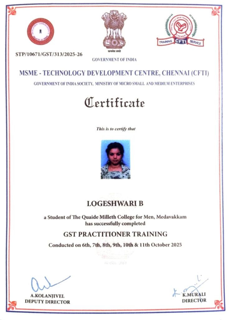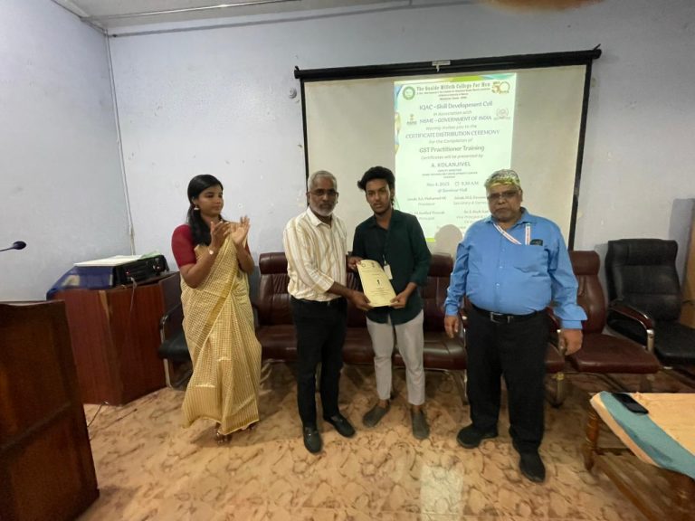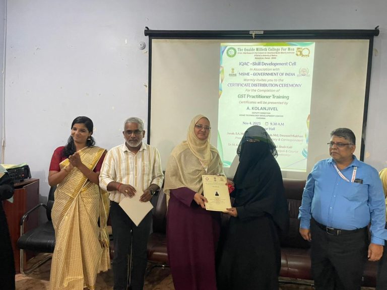 On 4th November 2025, The IQAC- Skill Development Cell in association with MSME, Govt. of India had a certificate distribution ceremony for the final year students on the completion of  “GST Practioner Training“.  This initiative aimed to equip students with practical GST knowledge and skills, enhancing their employability and career prospects.215 students received their Certificate after the successful completion of training and assessment.